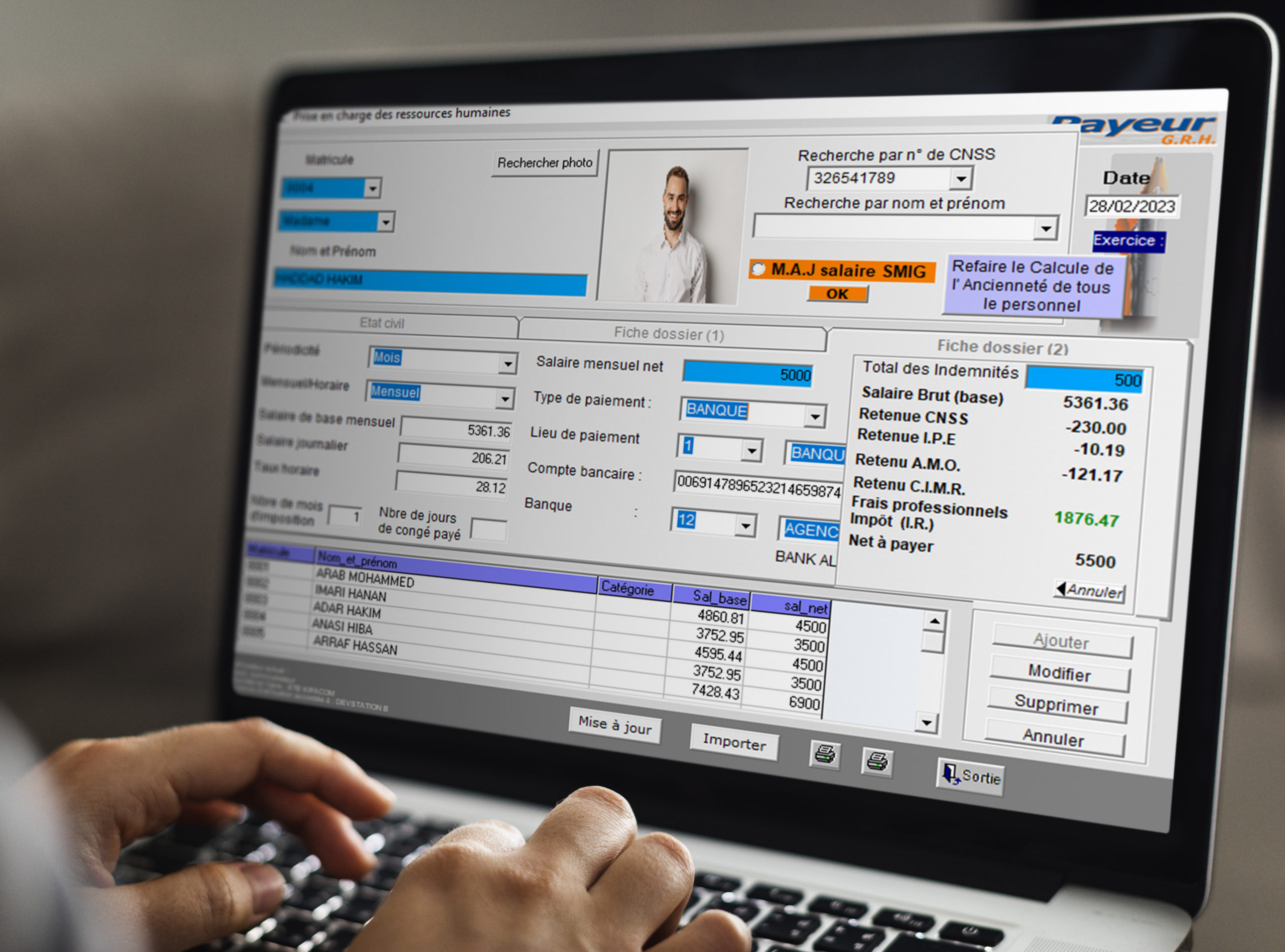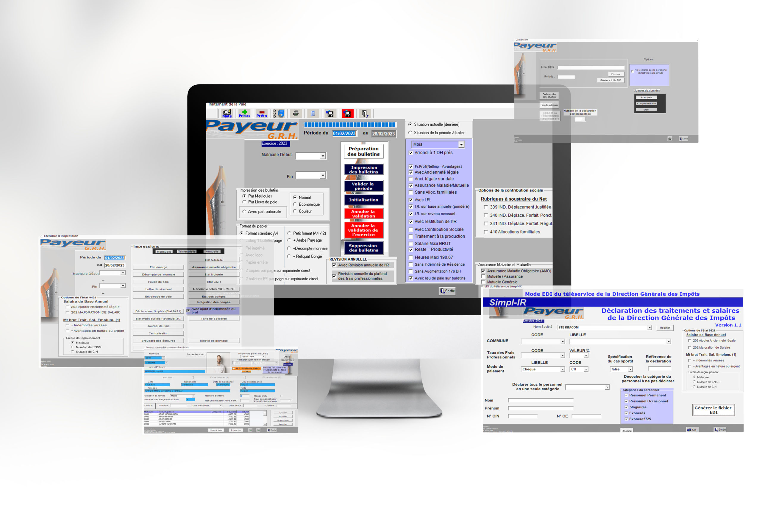 ›États Traitement de la paie périodique ; ›Prise en charge du personnel ; ›Nombre illimité de salariés (3000 ,2000… et +) ; ›Calcul des bulletins de paie ; ›Calcul du salaire brut à partir du net ; ›Suivi automatique des congés payés; ›Gestion des contrats de travail CDD, CDI… etc ; ›Gestion des prêts au personnel ; ›Lettre de virement automatique ; ›Enveloppes mensuelles par salariés ; ›Edition de tous les états de déclarations ; ›Traitement lié à la pointeuse ; ›Traitement à la tâche (productivité) ; ›Importation des données ; ›Intégration à la comptabilité ; ›Télédéclaration CNSS Damancom ; ›Télédéclaration CIMR ; ›Télédéclaration traitements et salaires (9421).